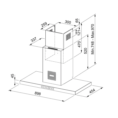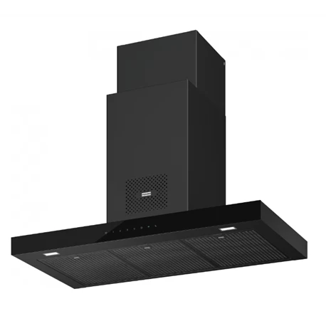 Hotte box Mythos AirHub de Franke, ref 221466, coloris noir et de largeur 90 cm. Purificateur de l’air par lampes UVC avec 3 modes : manuel, jour et nuit. 3 vitesses + intensive. Fonction 24 h. Arrêt programmé de 30 min. Alarmes saturation des filtres. Eclairage LED 2 x 1 W / 4000 K. Filtres charbon inclus. Commandes sensitives. Code EAN: 7612986221466, code FUN: 325.0679.323