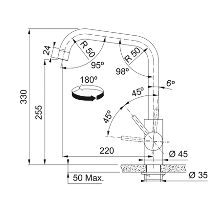 Mitigeur cuisine à bec Kubus réf 474702 de Franke, inox, rotation du bec sur 360°, embase Ø50 mm, perçage Ø35 mm, levier de commande -6°/90°, débit 12,7 L/min, hauteur 330 mm, code EAN: 7612985474702. Code FUN: 115.0529.202.