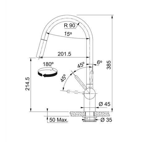 Mitigeur cuisine à douchette monojet Leda Neo tout inox de Franke, ref 728812. Rotation du bec sur 180°. Embase ø 45 mm. Perçage ø 35 mm. Levier de commande : 0°/ 90°. Débit 10,4 L/min (3 bars). Cartouche ø 35 mm. Ecoulement laminaire. Système de fixation avec corps fileté. Code EAN: 7612985728812, code FUN: 115.0590.047