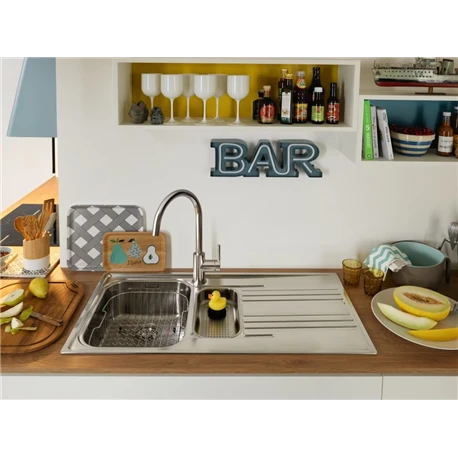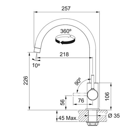 Mitigeur cuisine Lina J de Franke, coloris chrome, à bec, ref 294576. Rotation du bec sur 150°. Embase ø 54 mm. Perçage ø 35 mm. Levier de commande 0°/90°. Débit 14 L/min (3 bars). Cartouche ø 35 mm. Système de fixation avec corps fileté. La manette se positionne à droite. Code EAN: 7612986294576, code FUN: 115.0693.228
