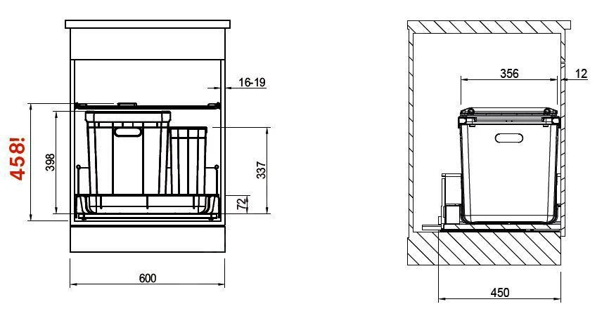 Les bacs 350, Trolley Vario et Easysort sont placés dans un tiroir à coulisse complète équipé d’un cadre longitudinal ou d’une paroi latérale haute. Nous recommandons les dispositifs à coulisse complète des entreprises Blum, Grass ou Hettich pour ces poubelles.